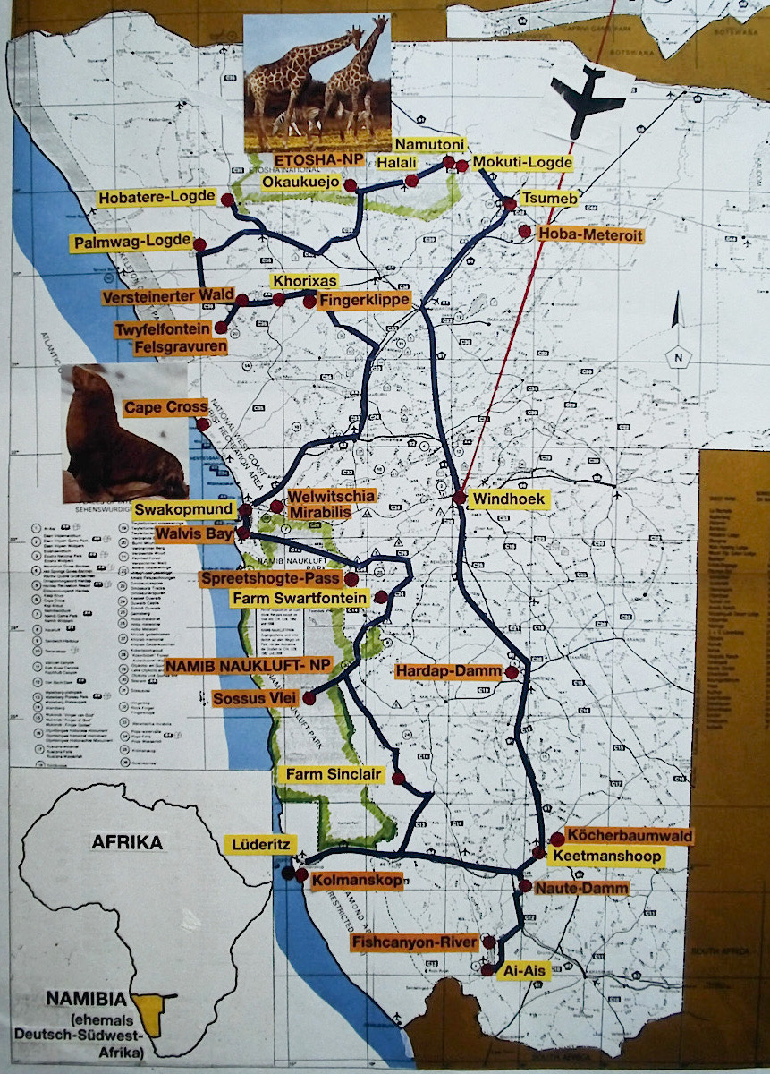 Mit dem Mietwagen reisten wir vom 27. August bis zum 19. September 1992 durch Namibia. Die Unterkünfte hatten wir vorher gebucht. Unser Flug ging nach Windhoek, der Hauptstadt der ehemaligen deutschen Konlonie Namibia.