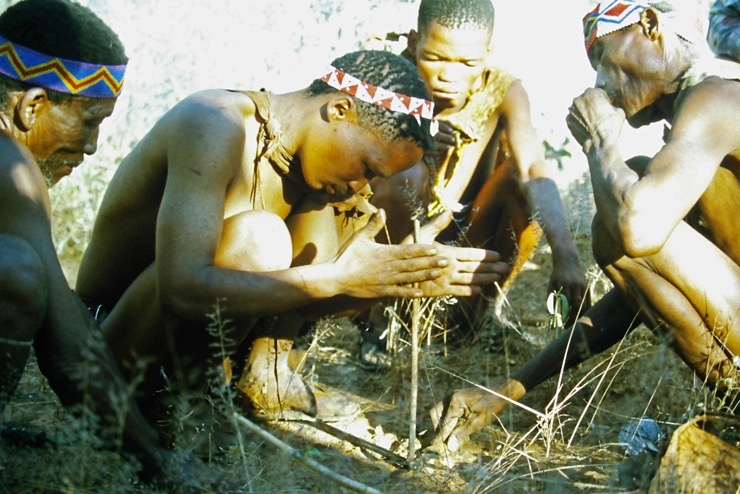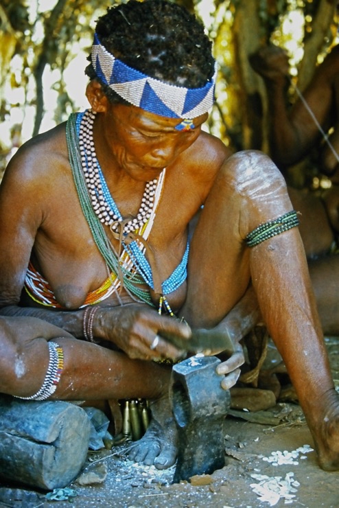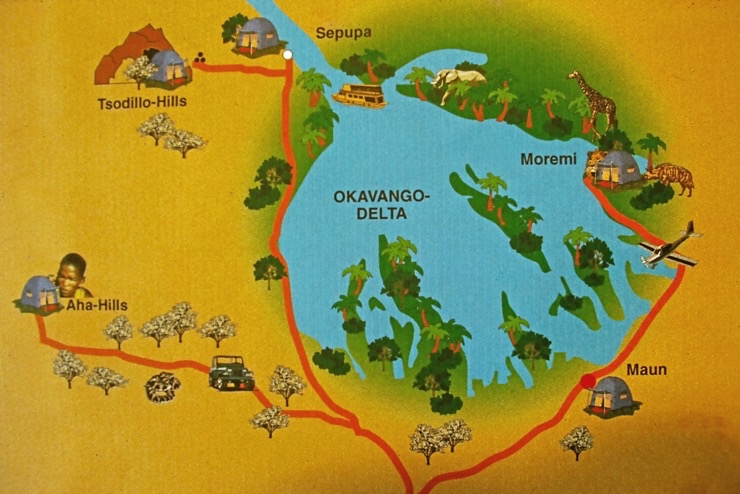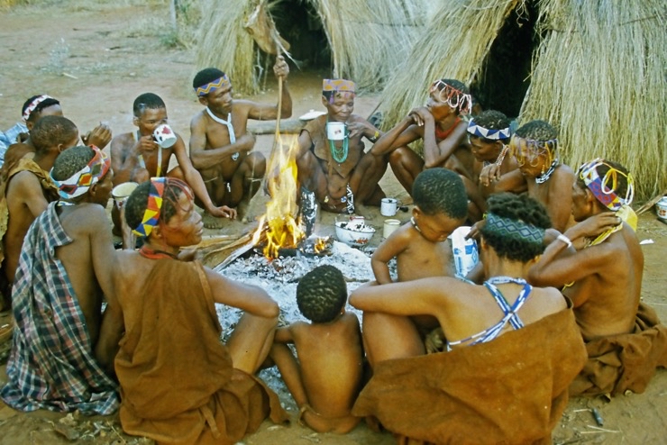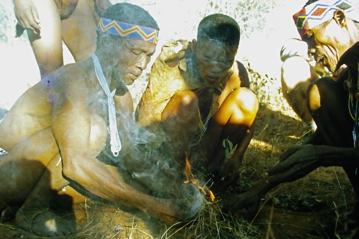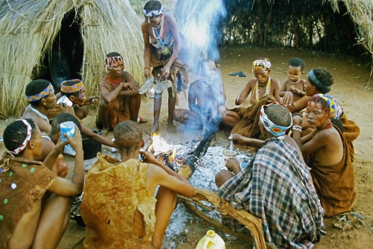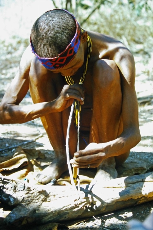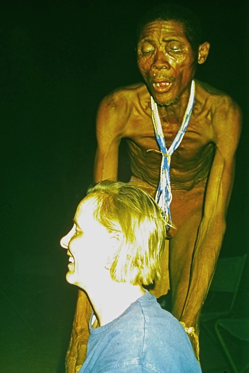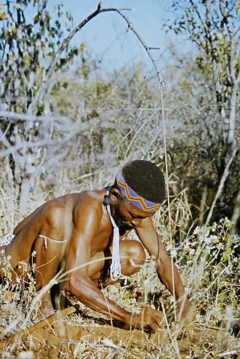 Wir kamen in Maun an und fuhren mit Tiaans Safari-Auto direkt zu den Aha-Hills. Hier bestand die Möglichkeit, mit Nachfahren der Buschmänner zwei Tage zu verbringen – traditionell im Busch. Sie zeigten uns, wie sie sich früher kleideten, wie sie jagten und in der trockenen Savanne überlebten.