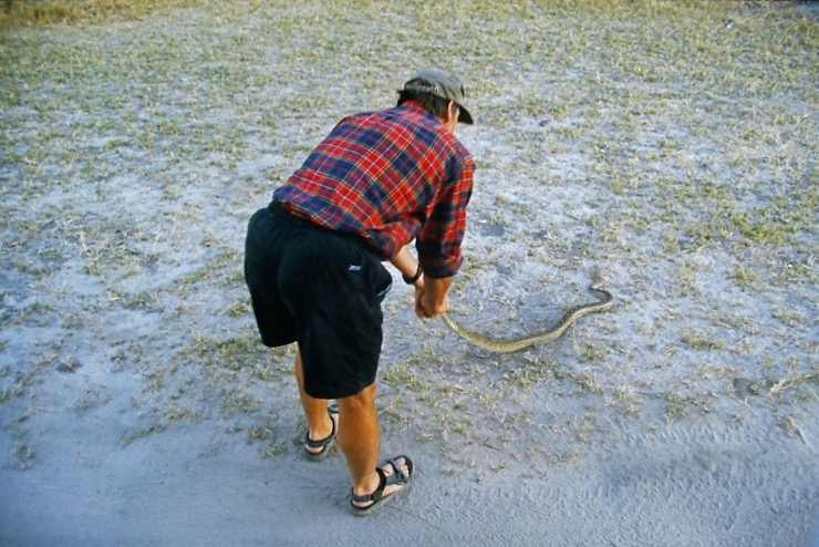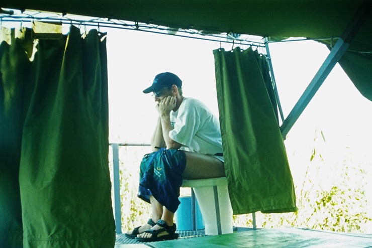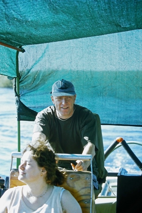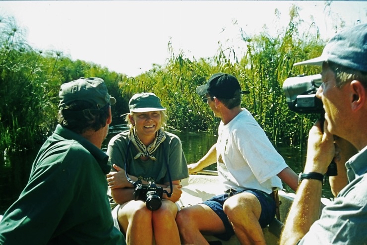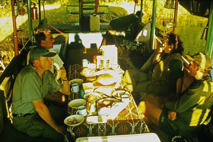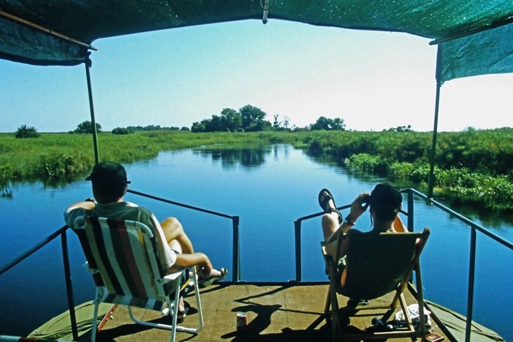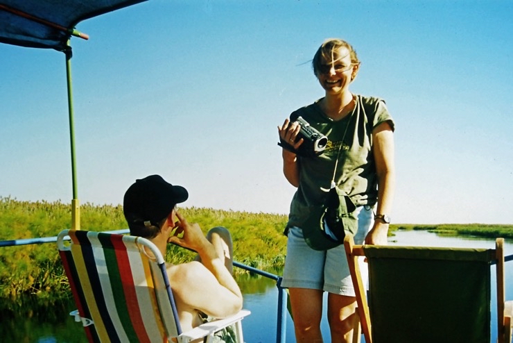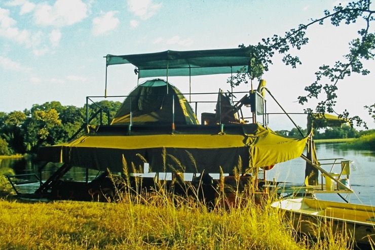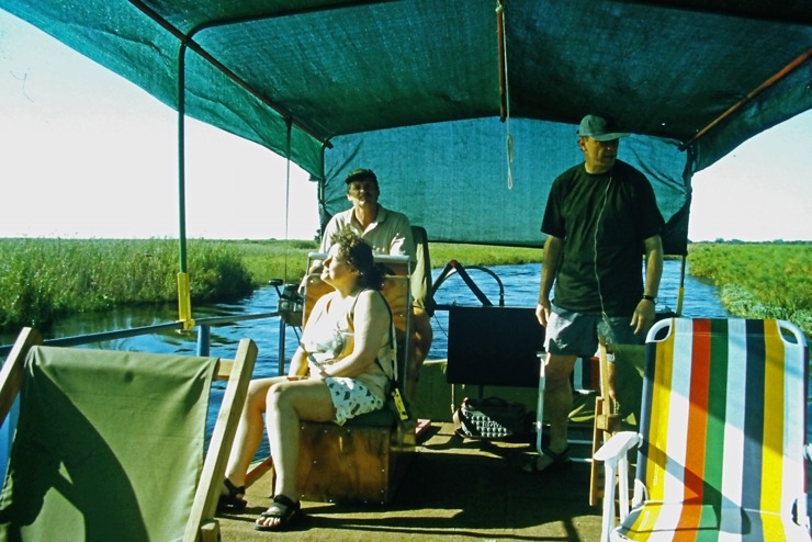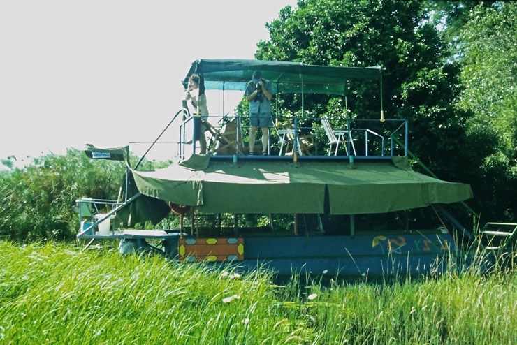 Tiaan war Besitzer eines Hausbootes. Mit diesem schipperten wir durch einen Teil des Okavangodeltas. Da es in diesem Jahr in Angola ungewöhnlich viel Niederschlag gegeben hatte, war fast alles unter Wasser. Viele Inseln waren überschwemmt. Somit mussten wir unsere Lager immer auf Festland aufstellen. Das war schade, denn viele Tiere bekamen wir nicht zu sehen. Das Erlebnis mit dem Hausboot zu fahren blieb uns.