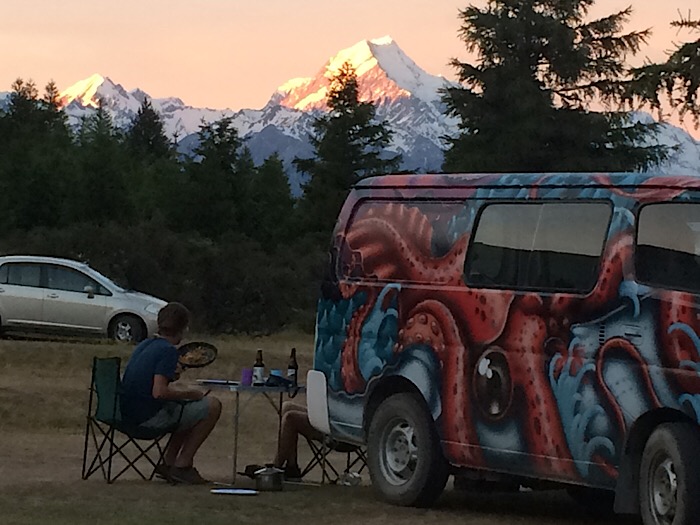 Auch von unserem Stellplatz haben wir Aussicht auf den schneebedeckten Berg.