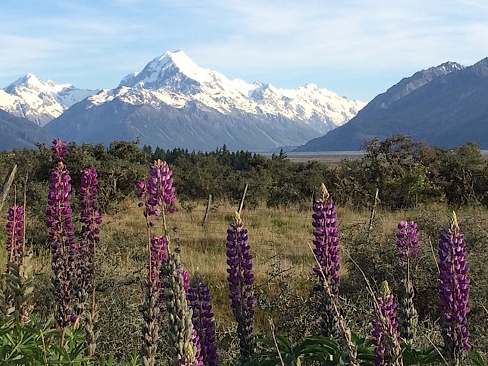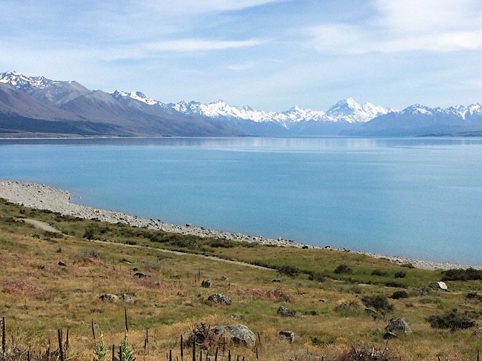 5:23 Aufstehen! Wir haben ungefähr 320 km vor uns. Der Mount Cook ist unser Ziel. Schon am Südende des Pukaki Lake können wir den höchsten Berg Neuseelands sehen.