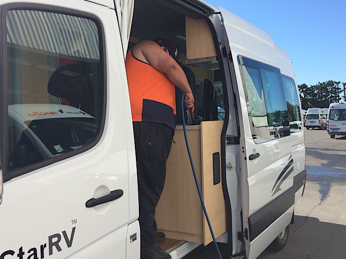 Nach einer erholsamen Nacht und einem guten Frühstück fuhren wir zur Vermietstation unseres Campers. Der Abfluss der Spüle war verstopft. Eine Reparatur war angesagt.